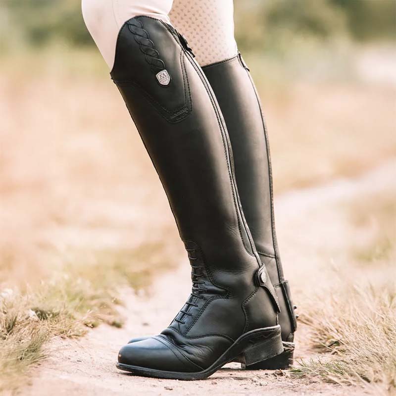 Les bottes d’équitation Valkyria de Mountain Horse sont fabriquées en cuir premium noir et souple, et sont équipées du Vertycore Advanced Sole System pour garantir une excellente absorption des chocs, une bonne adhérence et une grande stabilité. Les Valkyria disposent également d’un laçage élastique à l’avant, de détails décoratifs en haut de la tige, ainsi que d’une protection de fermeture éclair et d’un support d’éperons à l’arrière.