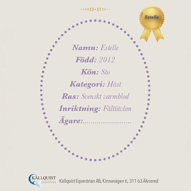 Estelle est un cheval bâton bai avec une étoile blanche sur le front, basé sur la race Warmblood suédois. Le cheval est fabriqué en polyester, avec une crinière et une mèche en fil qui peuvent être facilement tressées. Le bâton est en tremble, un bois léger offrant un bon équilibre à l'utilisation.