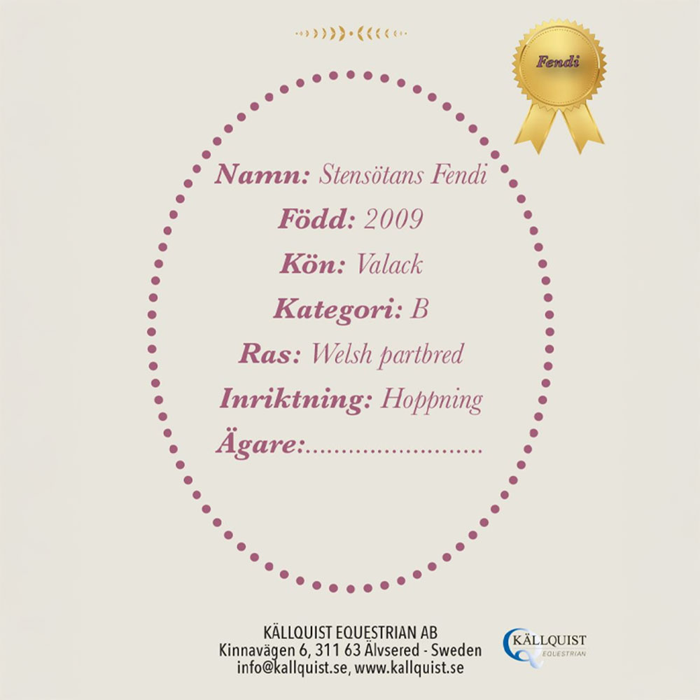 Fendi est un cheval bâton de couleur isabelle avec une liste blanche, basé sur la race Welsh Partbred. Le cheval est fabriqué en polyester, avec une crinière et une mèche en fil qui peuvent être facilement tressées. Le bâton est en tremble, un bois léger offrant un bon équilibre à l'utilisation.