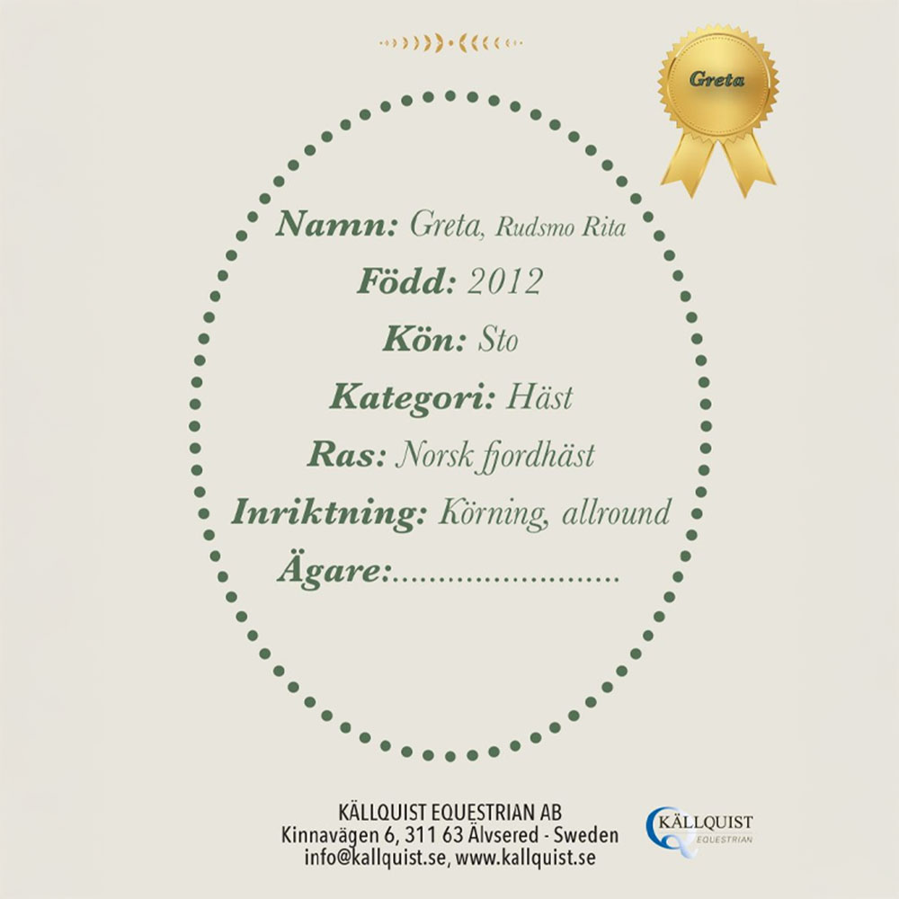 Greta est un cheval bâton de couleur isabelle, basé sur la race Fjord norvégien. Le cheval est fabriqué en polyester, avec une crinière et une mèche en fil. Le bâton est en tremble, un bois léger qui offre un bon équilibre à l'utilisation.