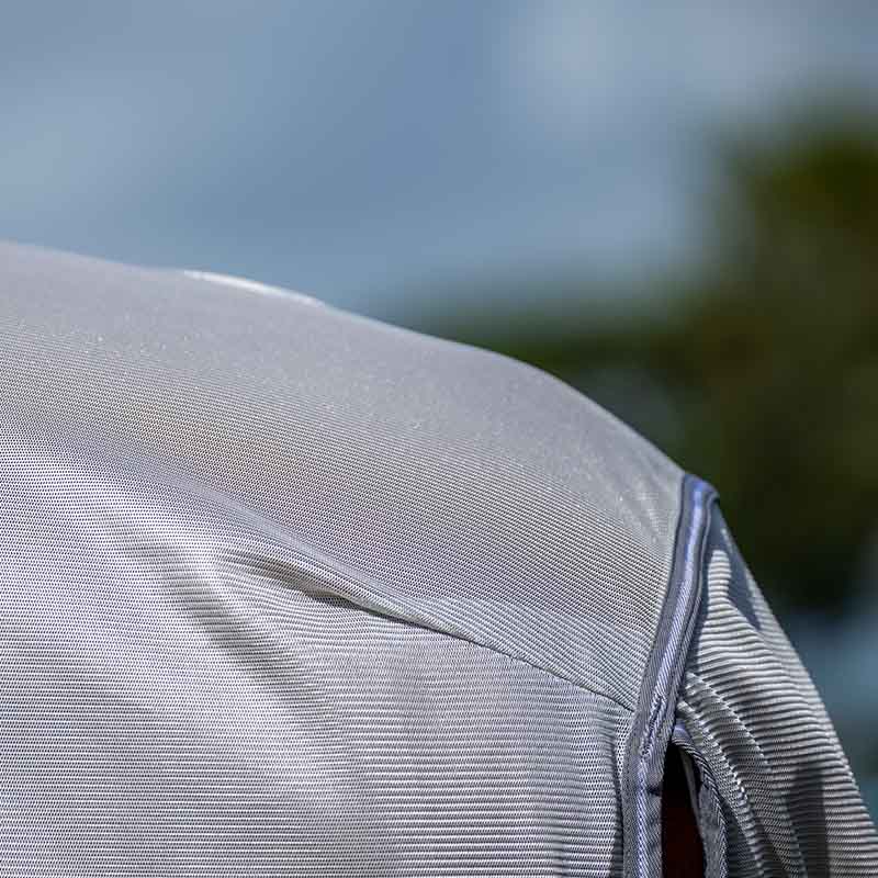 La couverture est fabriquée dans un mesh doux et tissé serré, à la fois léger et résistant, offrant environ 65 % de protection UV. Le matériau aide à protéger le cheval contre les rayons du soleil et les insectes gênants. Pour plus de confort, une doublure douce et soyeuse est placée au niveau de la crinière, des épaules et du rabat de queue extra large, ce qui aide à réduire la friction contre le pelage et à favoriser une robe plus brillante.