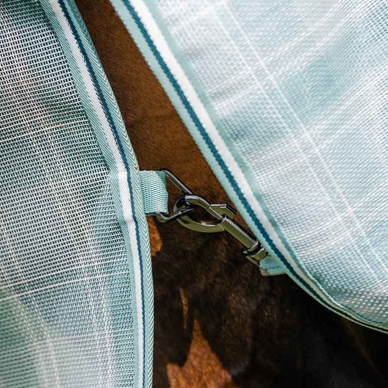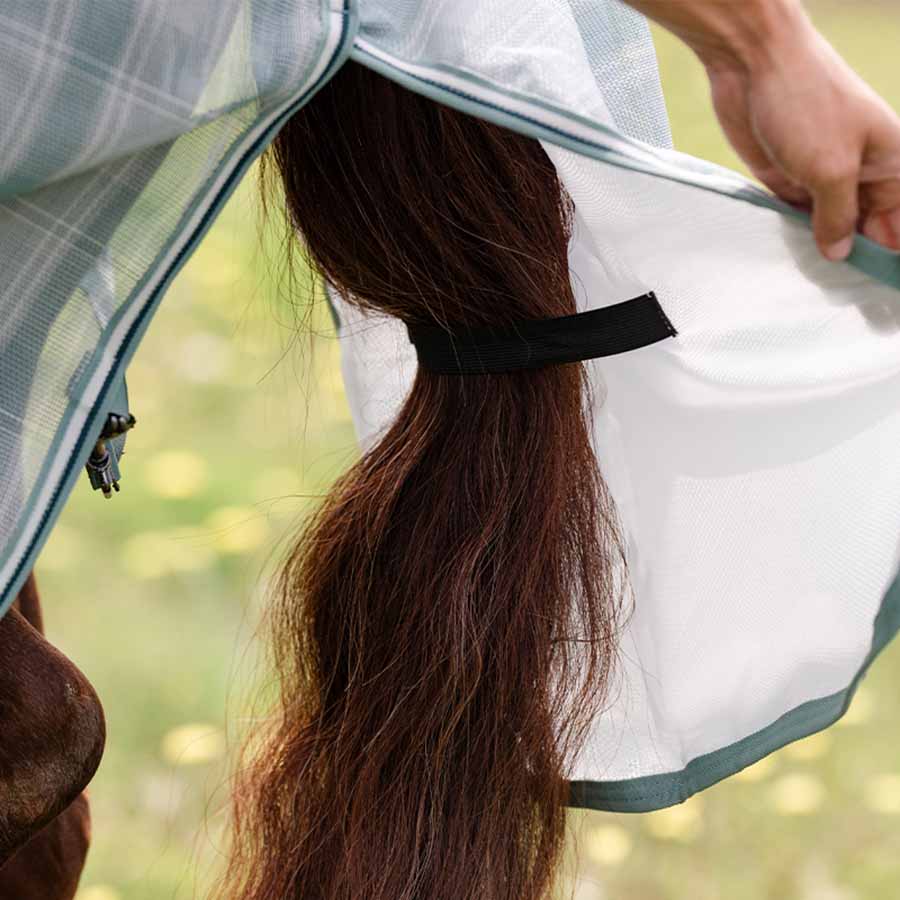 À l’avant, la couverture anti-insectes se ferme avec des boucles frontales droites, tandis que les découpes avant pour les jambes offrent au cheval une meilleure liberté de mouvement. Les sursangles croisées aident à maintenir la couverture bien en place. Le modèle est également équipé d’une courroie de queue facile à nettoyer ainsi que de passants pour courroies de jambes.