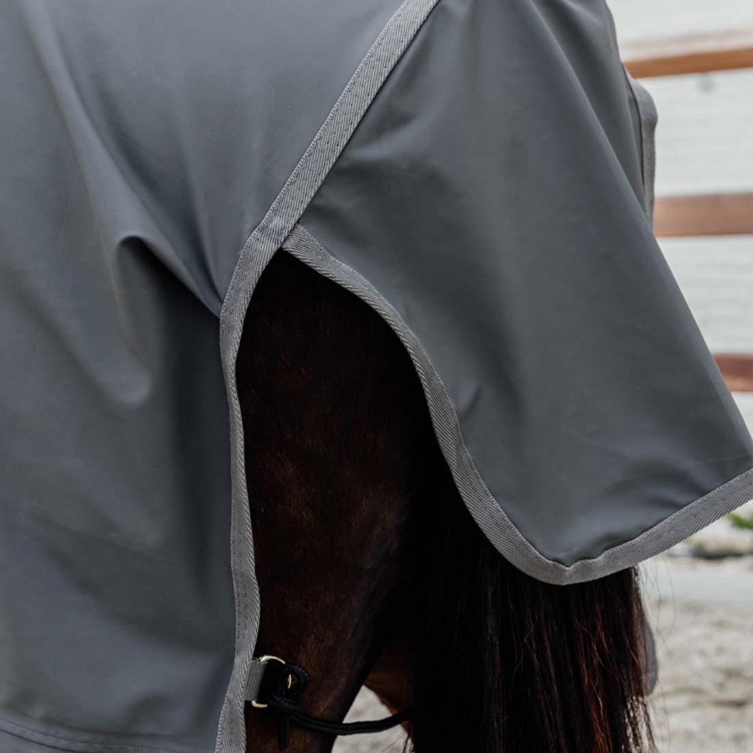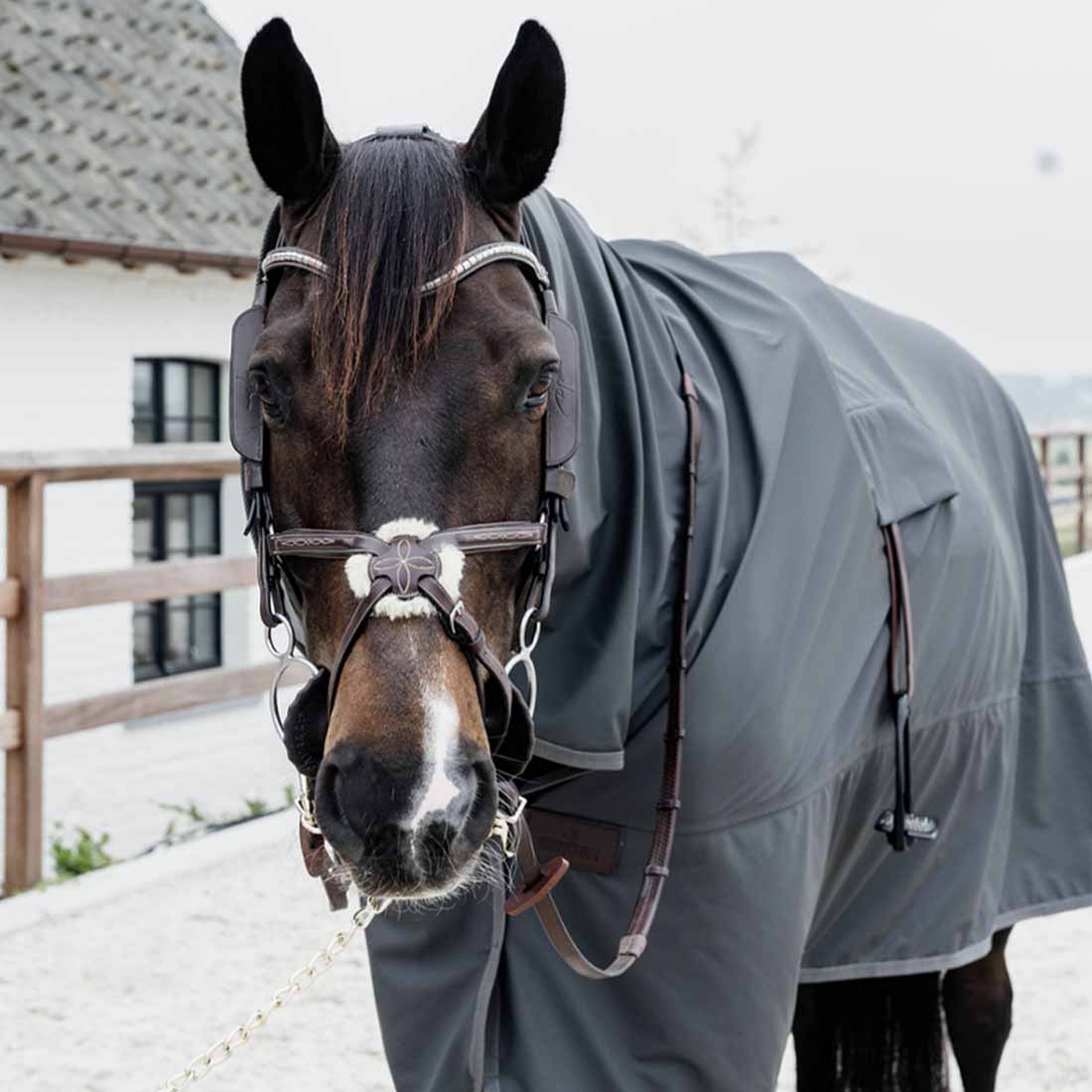 Avec deux ouvertures pratiques pour les étriers, vous pouvez utiliser cette feuille de pluie grise même en selle, et grâce à la corde ajustable pour la queue et la fermeture simple à l'avant, la couverture reste bien en place pendant toute la durée de la balade. Un attache à Velcro au niveau du cou ajoute une stabilité supplémentaire en permettant de fixer la couverture à un licol ou à une bride. De plus, cette feuille de pluie est légère et compacte, vous permettant de l'avoir facilement à portée de main pour l'utiliser rapidement lorsque le ciel s'ouvre soudainement.