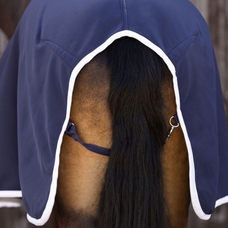 La couverture rafraîchissante Jersey Show d'ESKADRON en bleu marine est à la fois robuste et facile à entretenir, ce qui en fait un choix pratique pour votre cheval. Elle est dotée d'une doublure en polaire pour plus de confort et une grande respirabilité, aidant à garder le cheval au sec et à l'aise. La couverture est équipée d'une sangle réglable et d'une courroie de queue pour un ajustement sécurisé. Elle possède également un bord contrastant et un logo brodé au niveau du cou, ainsi qu'une plaque de broderie à l'avant pour un look élégant.