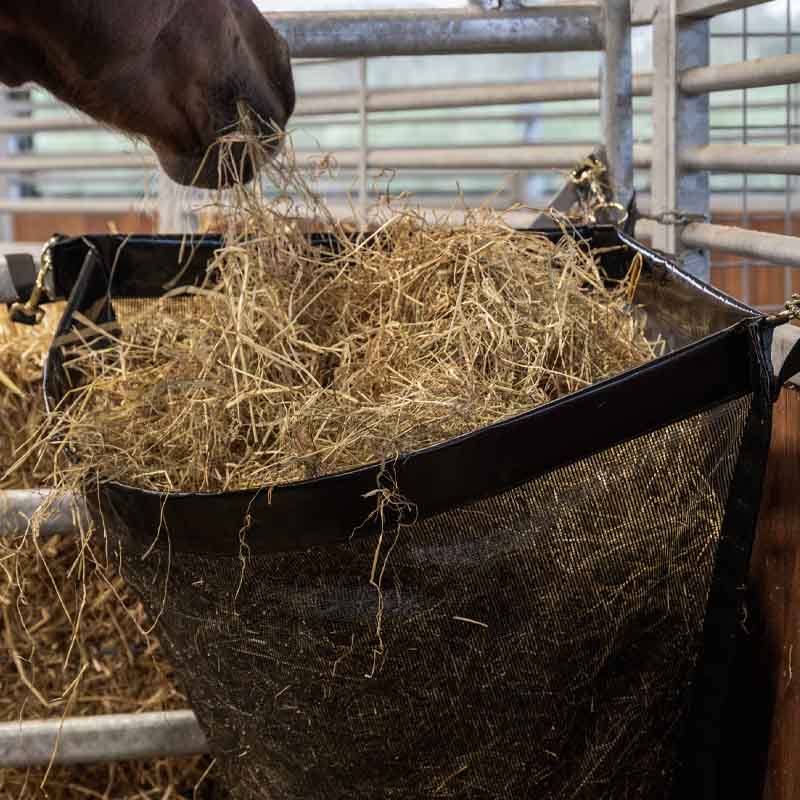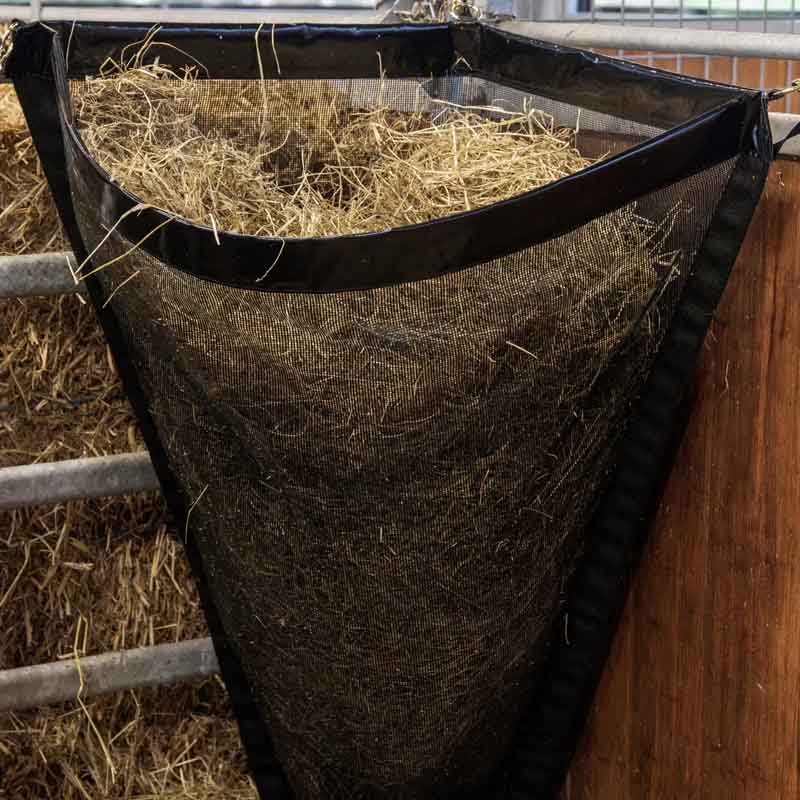 La grande ouverture sur le dessus facilite le remplissage, et l'ouverture en bas permet au cheval d'accéder facilement au reste du foin. Le produit est fabriqué dans un matériau résistant adapté à un usage quotidien, et sa maille fine réduit le risque que le cheval se coince un sabot ou un fer.