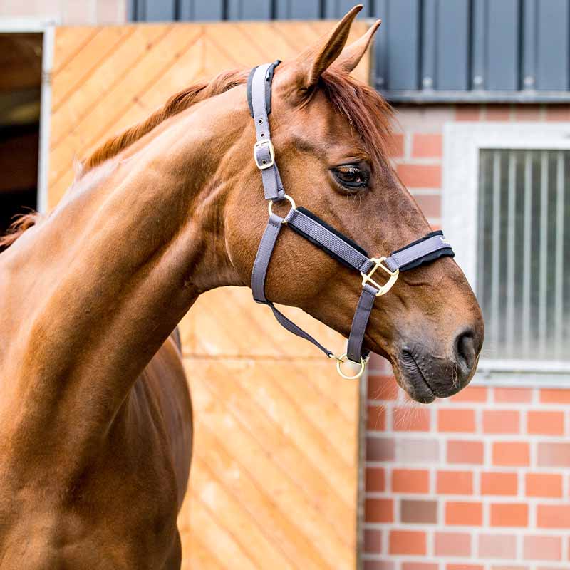Le licol gris est conçu avec de belles boucles métalliques dorées et peut facilement être ajusté pour s’adapter à la taille de votre cheval au niveau du nez et des montants.