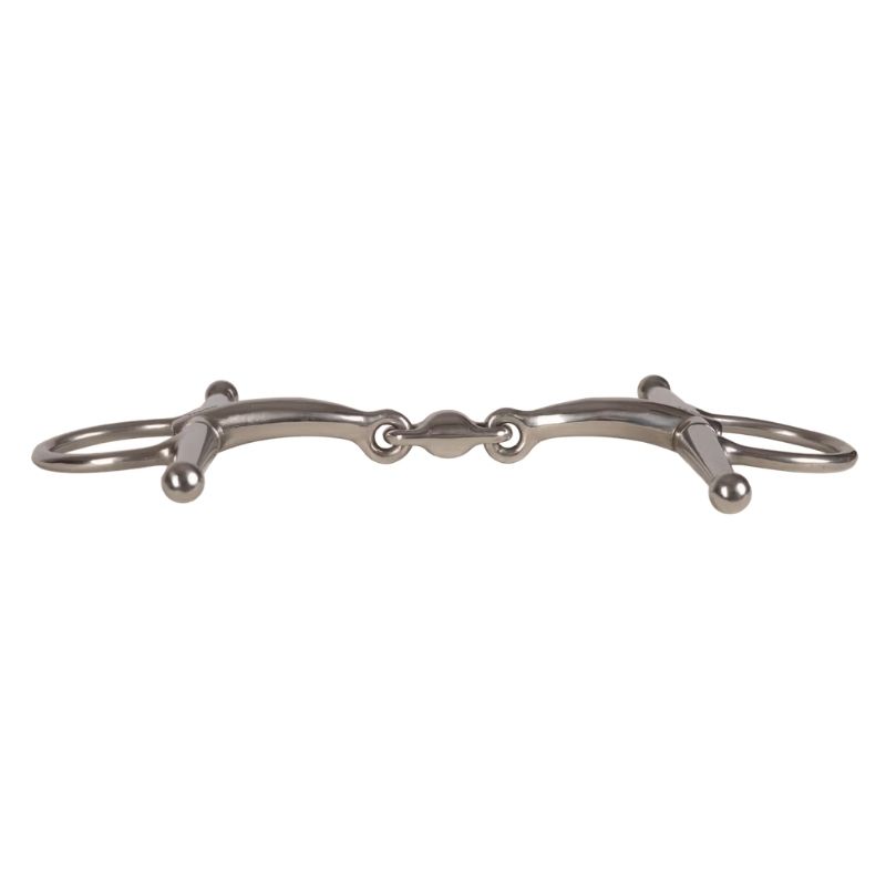 Le mors à jouets fixes double brisures VELARI est fabriqué en acier inoxydable, offrant une répartition uniforme de la pression et un contact stable. Son design à jouets fixes fournit un soutien latéral clair, aidant les chevaux à comprendre les aides de rênes, ce qui le rend particulièrement adapté aux chevaux plus jeunes ou moins expérimentés. L'embouchure à double brisure réduit l'effet de casse-noisette et répartit la pression uniformément sur la langue et les barres, offrant une sensation douce et réactive. Cette construction est idéale pour les chevaux avec un palais plus bas et ceux sensibles à la pression des mors à simple brisure. L'embouchure en acier inoxydable offre un goût neutre, le rendant adapté aux chevaux qui préfèrent un contact simple et stable.