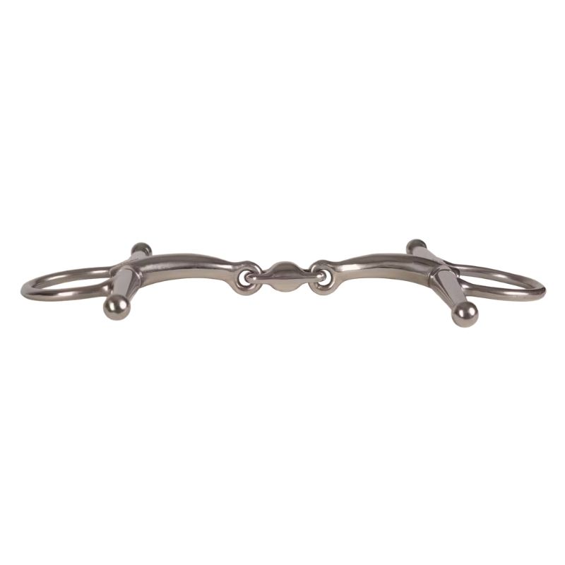 Le mors à jouets fixes VELARI est un mors à double brisure en acier inoxydable, conçu pour offrir une répartition uniforme de la pression et un contact stable. Les jouets fixes offrent un soutien latéral clair, aidant le cheval à comprendre les aides de rênes, ce qui le rend particulièrement adapté aux chevaux plus jeunes ou moins expérimentés. L'embouchure à double brisure réduit l'effet casse-noisette et répartit la pression uniformément sur la langue et les barres, offrant une sensation douce et réactive. Ce mors est idéal pour les chevaux avec un palais plus bas et ceux sensibles à la pression des mors à simple brisure. Rincez le mors à l'eau tiède après utilisation et séchez-le soigneusement. Rangez-le au sec et vérifiez régulièrement l'usure.
