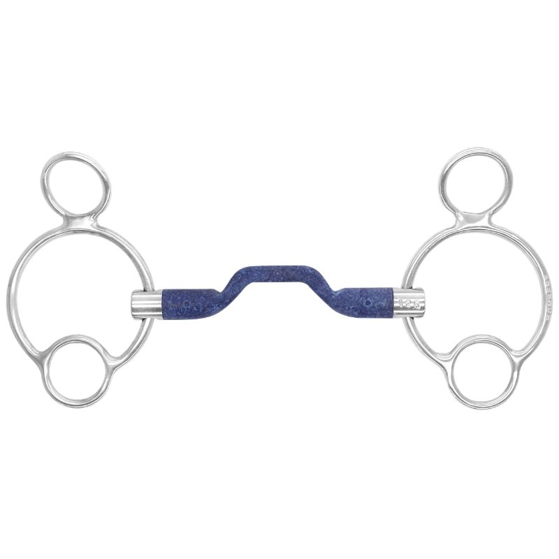 Le mors Bomber Blue à 2,5 anneaux de Bombers est un mors multi-anneaux qui combine une pression sur la nuque avec un léger effet releveur sur l’embouchure. Cette version à 2,5 anneaux est la plus douce de sa catégorie, grâce au demi-anneau qui réduit l’effet releveur et offre une action plus douce par rapport aux modèles avec plus d’anneaux complets. Également connu sous le nom de mors Pessoa, le Bomber Blue dispose d’une embouchure unique avec passage de langue qui offre une bonne liberté de la langue, et le matériau synthétique léger le rend confortable dans la bouche du cheval tout en stimulant la salivation.