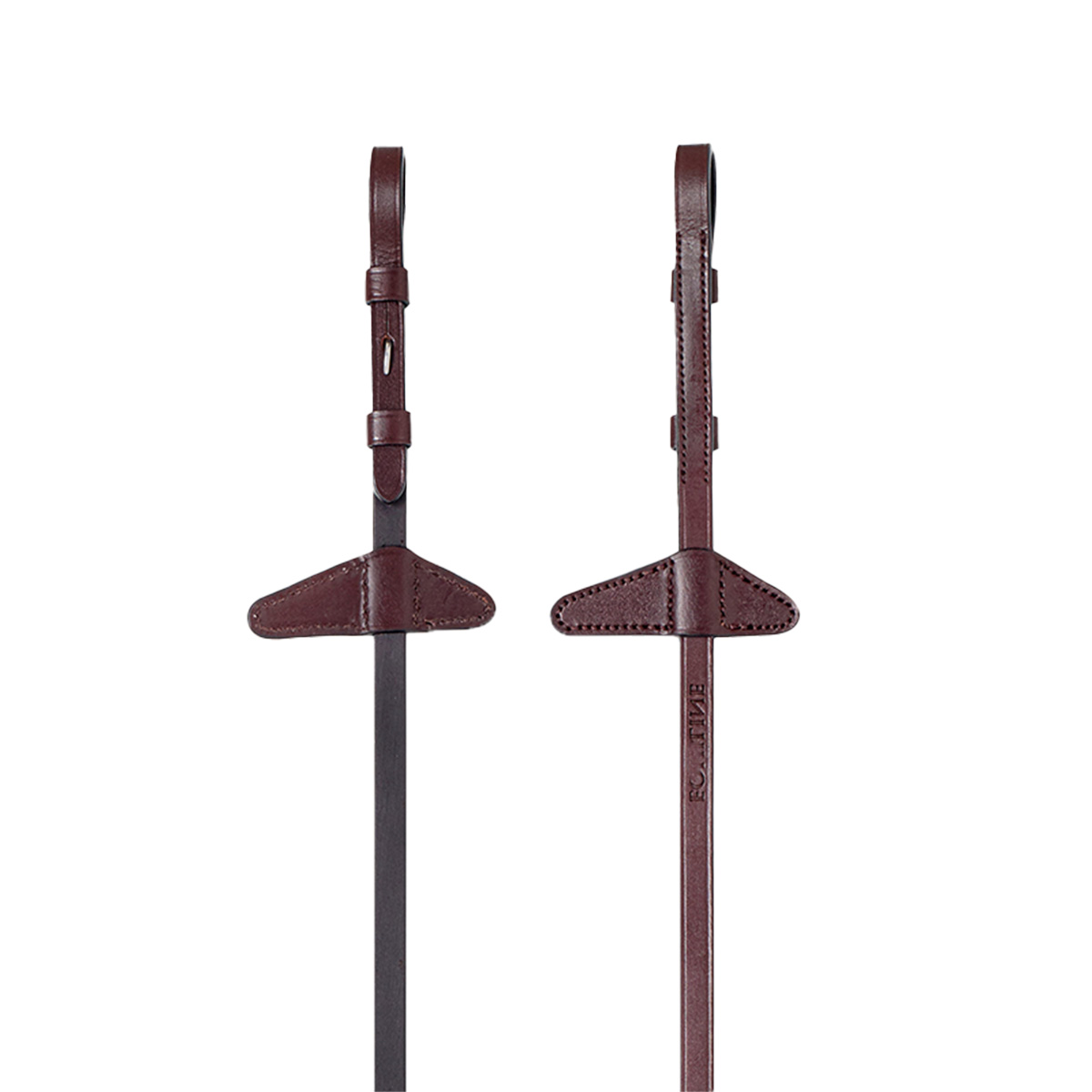 Rênes en caoutchouc classiques marron, de Equiline, qui vous offrent une prise optimale. Conçues avec des boucles tournées vers l'intérieur ainsi que de larges arrêtoirs de martingale en forme de triangle.Lire la suite