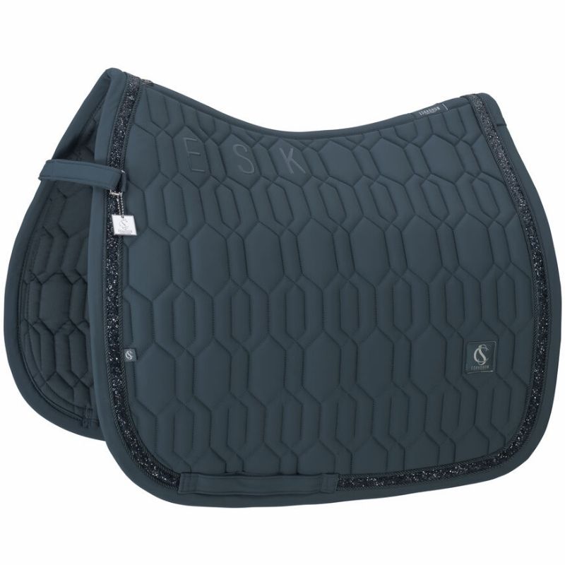 Le tapis de selle dressage Eskadron Softshell Jewel Classic Sports en vert allie élégance et praticité. L'extérieur est en softshell robuste, tandis que l'intérieur est doté d'une doublure cool-dry pour un confort optimal. Son matelassage compact offre un design élégant, et la surface antidérapante en silicone sous la selle assure une bonne tenue en place. Une combinaison élégante de passepoils et de pierres avec un bord en softshell ajoute une touche de luxe.