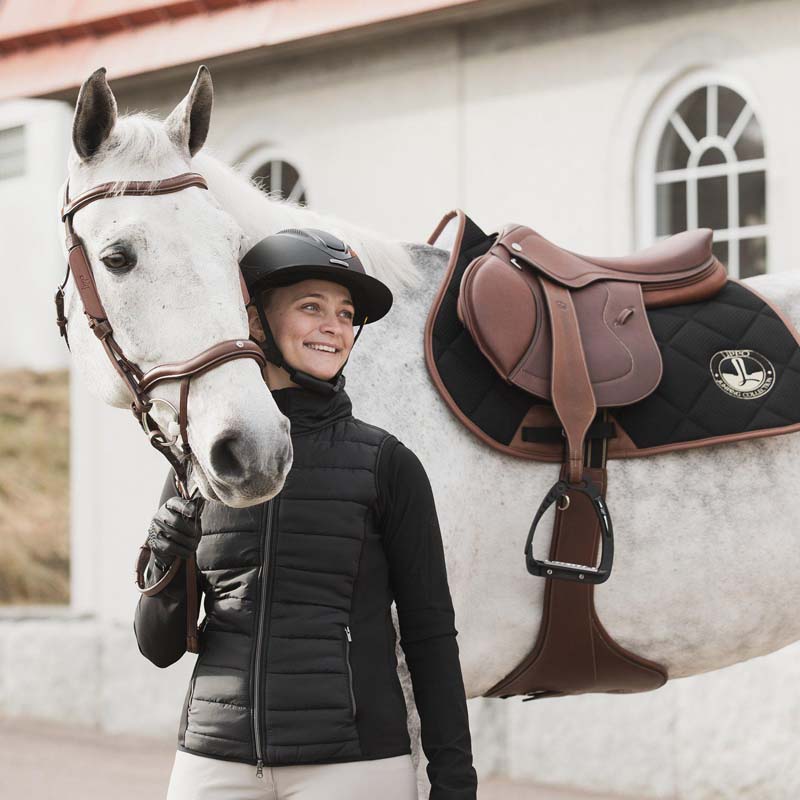 Le Tapis de selle Lippo en Waffle Texture fait partie de la Lippo Jumping Collection. Ce tapis de selle allie douceur luxueuse et fermeté, avec un passepoil en cuir écologique élégant. Il offre un excellent ajustement qui repose bien sur le cheval, avec un intérieur en mélange de coton hautement ventilé avec Waffle Texture. Le matériau durable et robuste est absorbant la sueur et naturellement respirant. Il comprend une sangle de sangle avec Velcro et un logo brodé décoratif sur le côté gauche. Lavable en machine à 30 degrés.