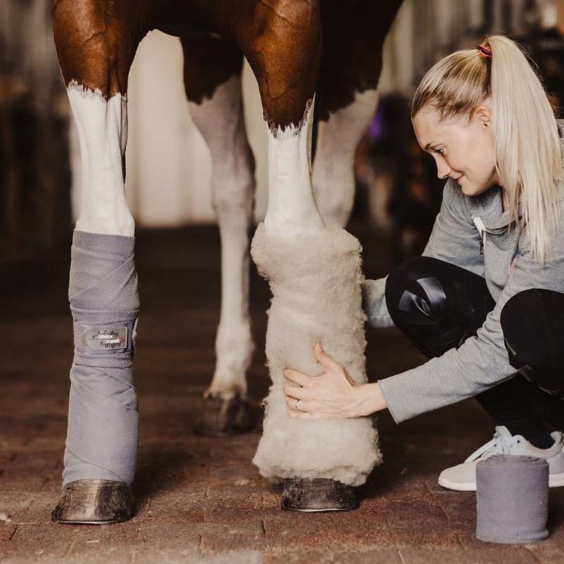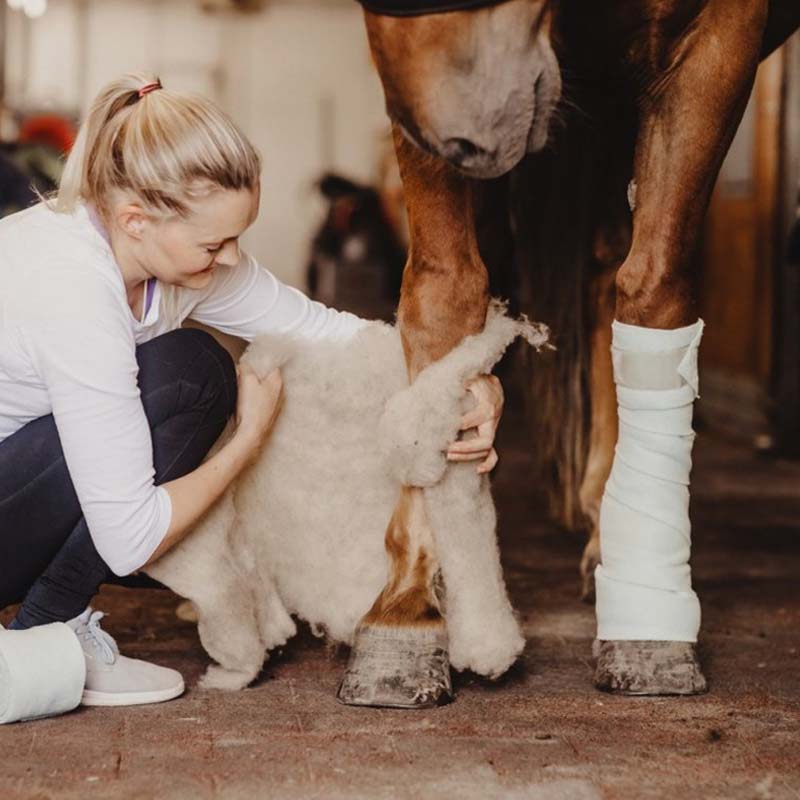 Enveloppez la laine autour d'une jambe sèche et jusqu'en dessous du boulet. Laissez le bandage en place toute la nuit. Si vous gardez le produit sec et propre, les propriétés de la laine dureront environ un mois. Il peut également être utilisé pendant le transport ou pour la récupération après l'entraînement.