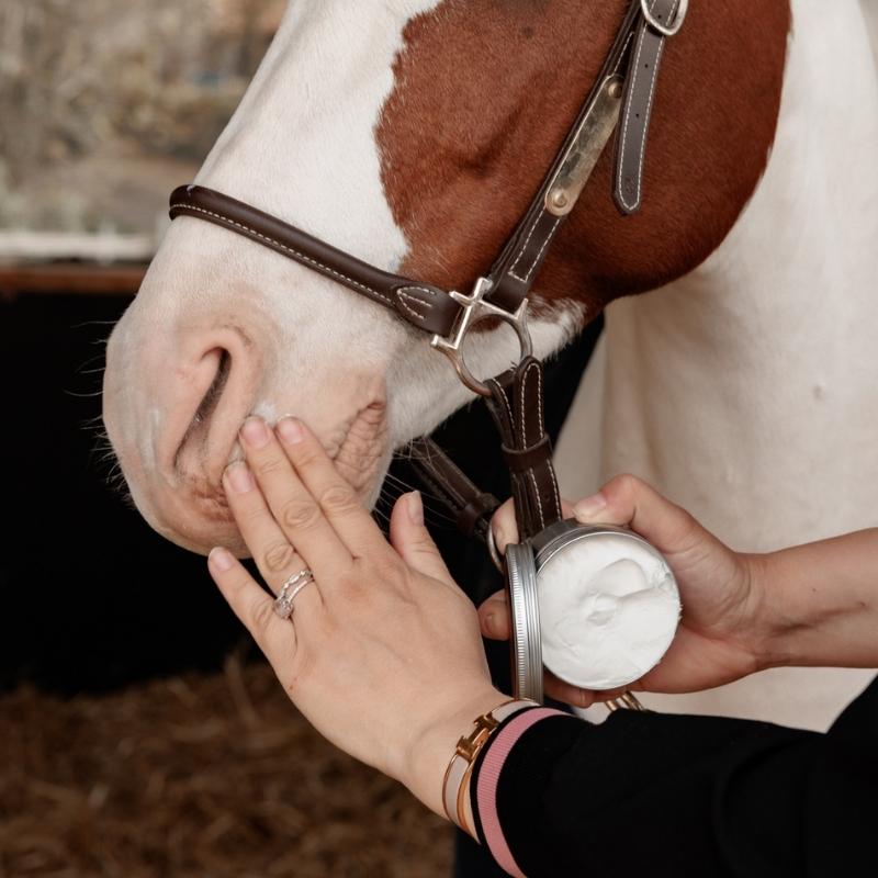 Appliquer une couche généreuse de Sunblock sur les zones exposées telles que le museau, les paturons et autres zones de peau avant l’exposition au soleil. Réappliquer si nécessaire, notamment si le produit est éliminé, même si sa formule résistante à l’eau assure une protection durable.
