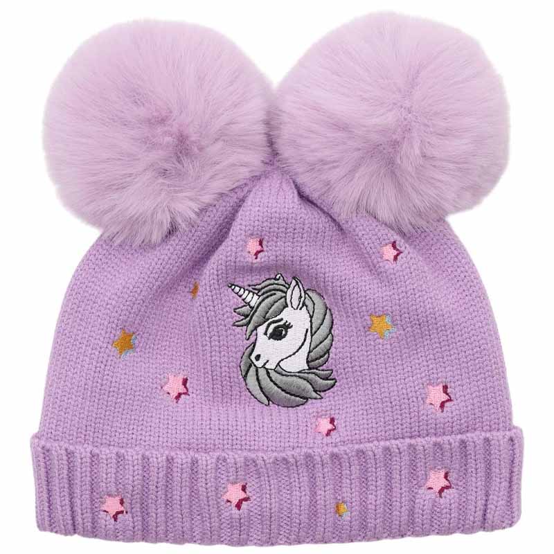 Bonnet coloré et amusant pour enfants et juniors. Le bonnet violet est orné d'une licorne brodée sur le devant et décoré de petites étoiles multicolores tout autour. Deux grands pompons en fausse fourrure sur le dessus apportent une touche ludique et charmante – parfait à l’écurie comme au quotidien !