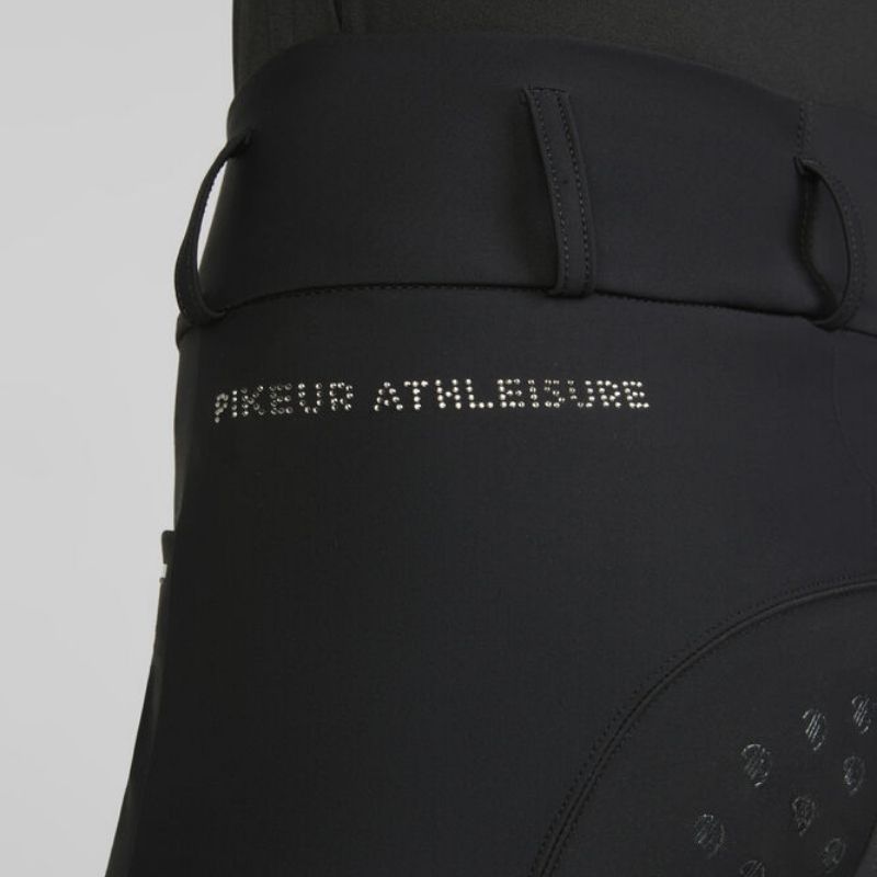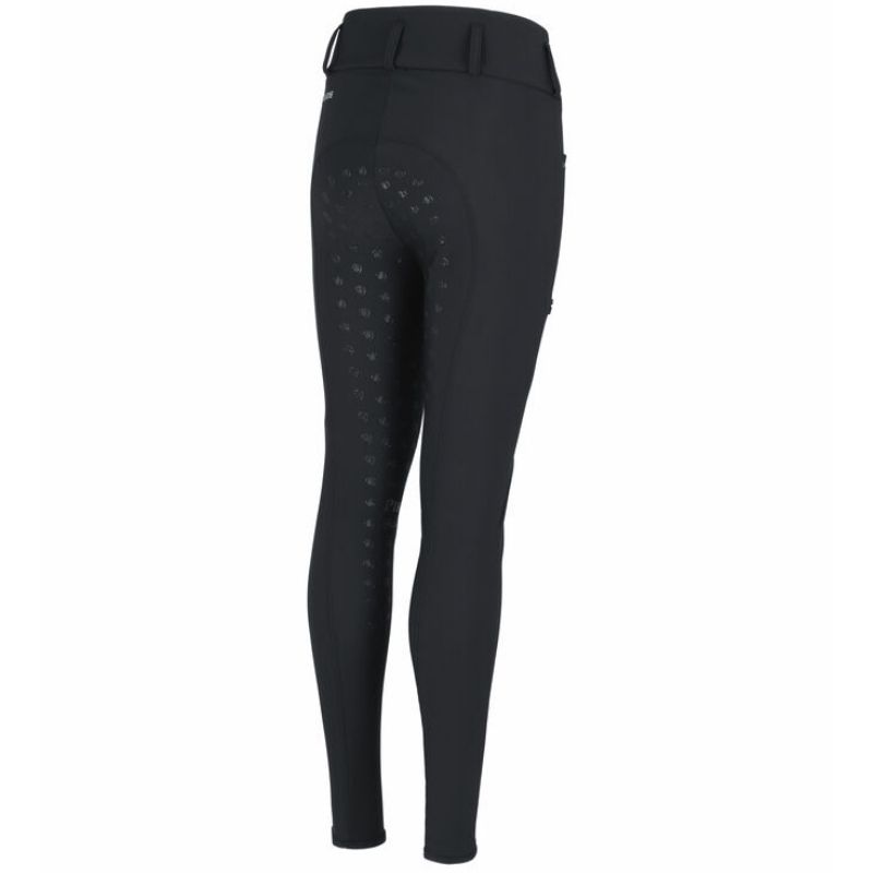 Le siège complet en GripTec assure une prise sûre en selle et une sensation de confort grâce à l'élasticité du matériau et à l'absence de coutures aux genoux. La large ceinture dans le même matériau que les collants offre un ajustement stable et, avec les passants de ceinture, combine fonctionnalité et design classique. Les grandes poches pour téléphone portable de chaque côté sont pratiques pour ranger de petits objets. Les détails en strass sur les poches et un logo en strass à l'arrière offrent une finition élégante et moderne.