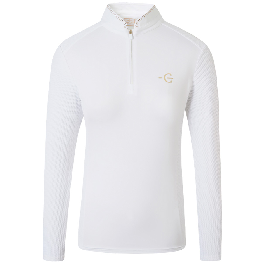Le haut de concours blanc à manches longues Covalliero est fabriqué dans une matière légère et fonctionnelle offrant une excellente respirabilité et des propriétés d’évacuation de l’humidité, idéal pour les journées de compétition les plus intenses.