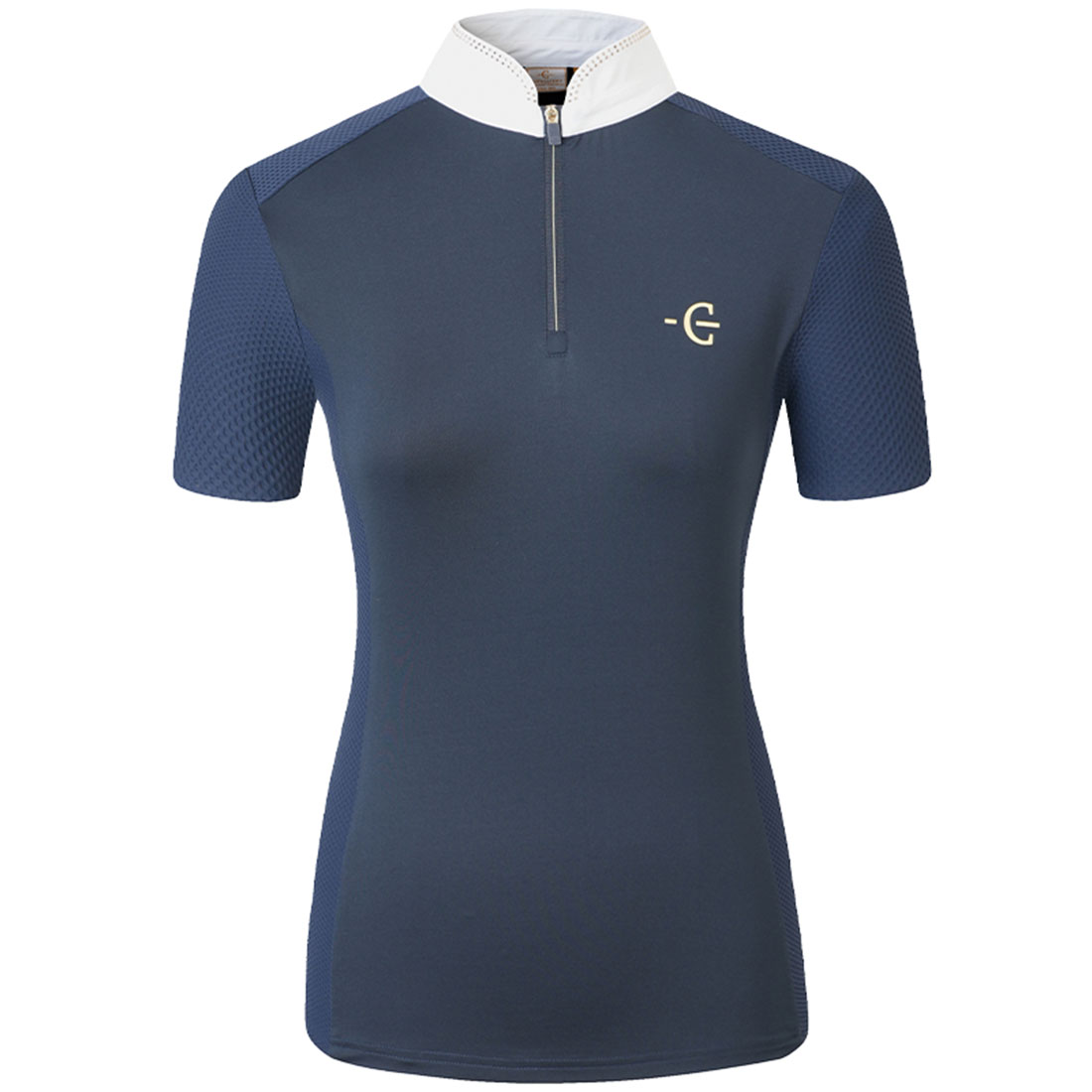 La chemise de concours à manches courtes Competition de Covalliero en bleu marine allie performance sportive et design élégant. Le matériau respirant et élastique assure un confort optimal et une liberté de mouvement maximale en selle. Le col haut élégant avec détail discret en paillettes ajoute une touche d'élégance.