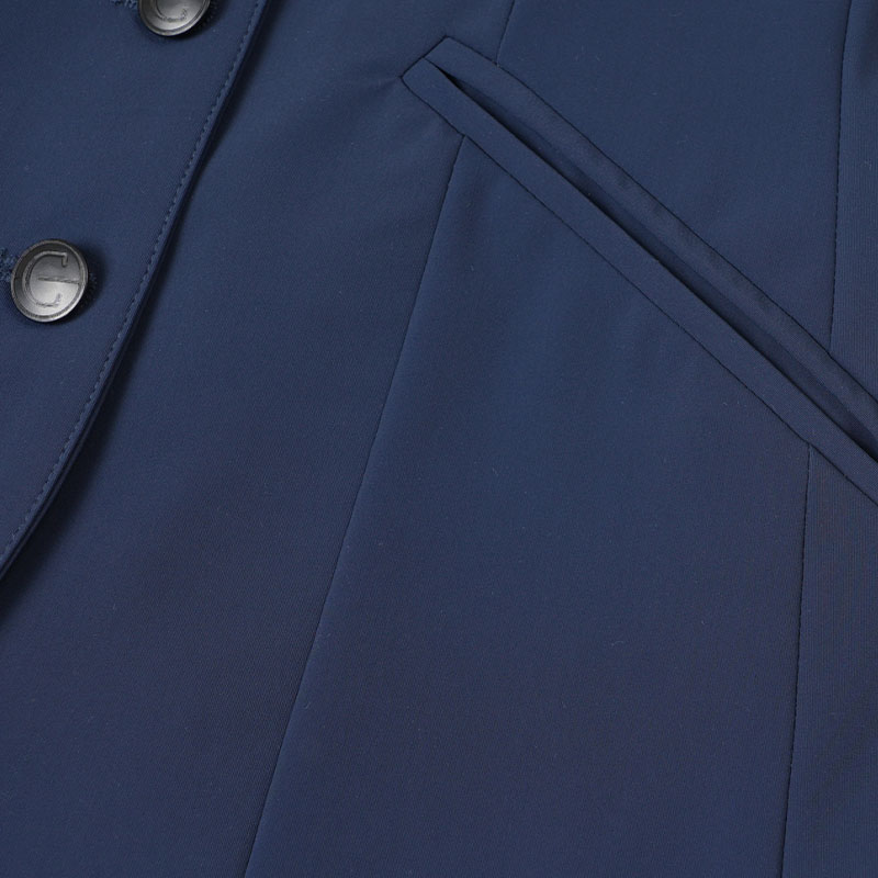 La veste de concours est conçue avec deux poches décoratives, deux fentes à l’arrière et se ferme à l’aide d’une fermeture éclair dissimulée et de quatre boutons.